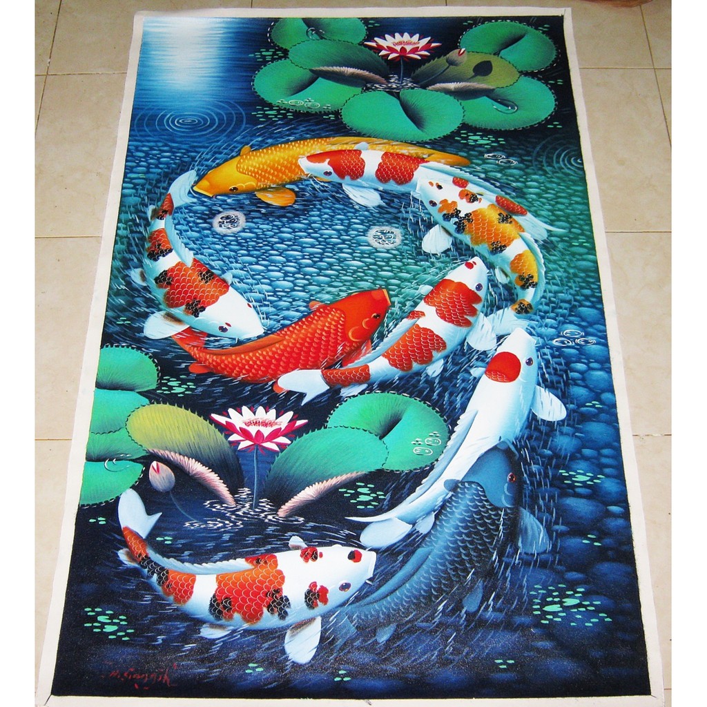 Foto Lukisan Ikan. Lukisan ikan koi gmk 08 | lukisan ikan koi merupakan. Lukisan asli tentang ikan koi 9 yang dibuat diatas kain kanvas berukuran 140 x 80 cm dengan menggunakan cat akrilik khusus yang berkualitas, sehingga menghasilkan karya seni yang bagus.